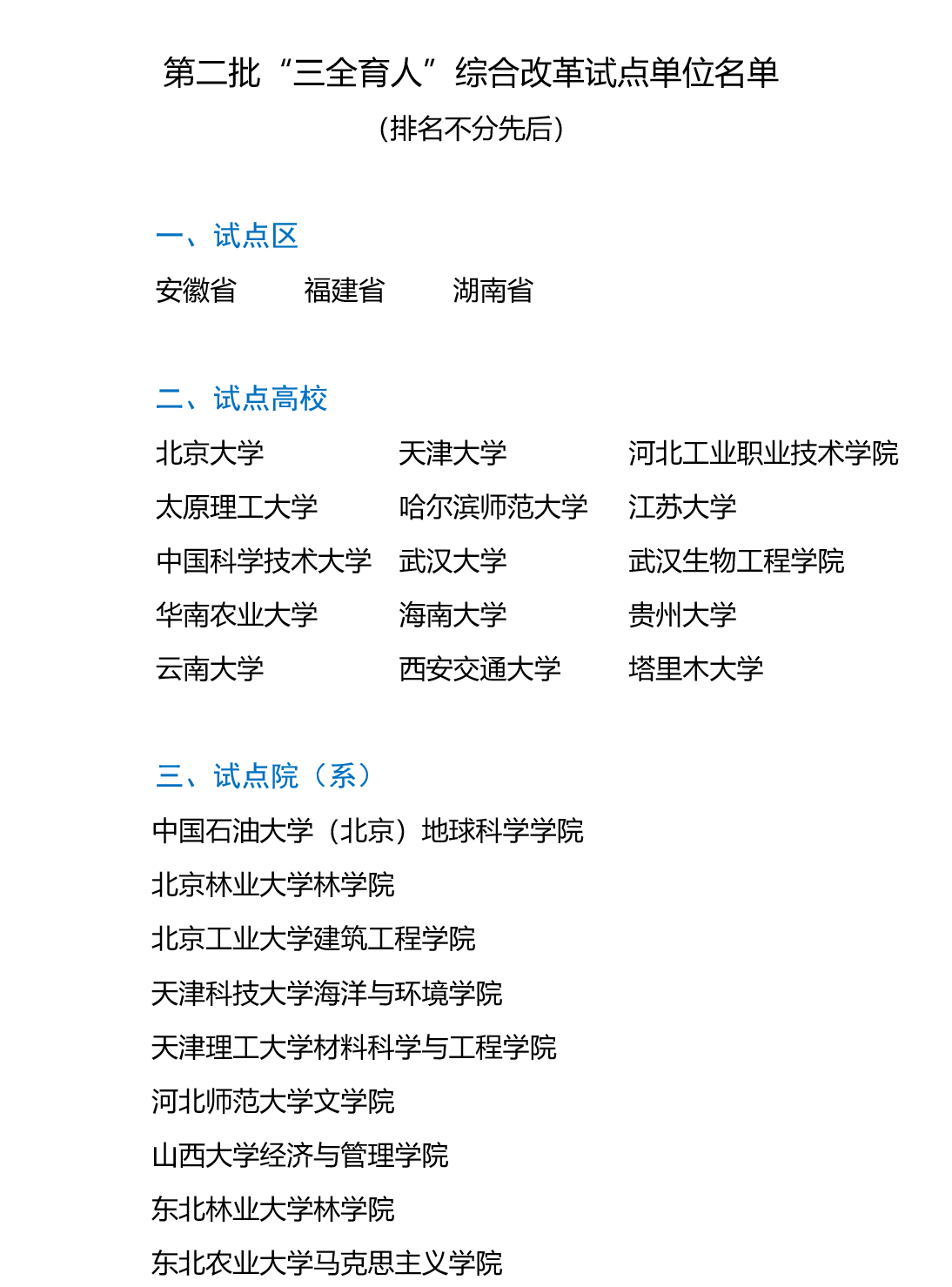 教育部办公厅关于公布第二批 “三全育人”综合改革试点单位名单的通知【 教思政厅函〔2019〕1号 】