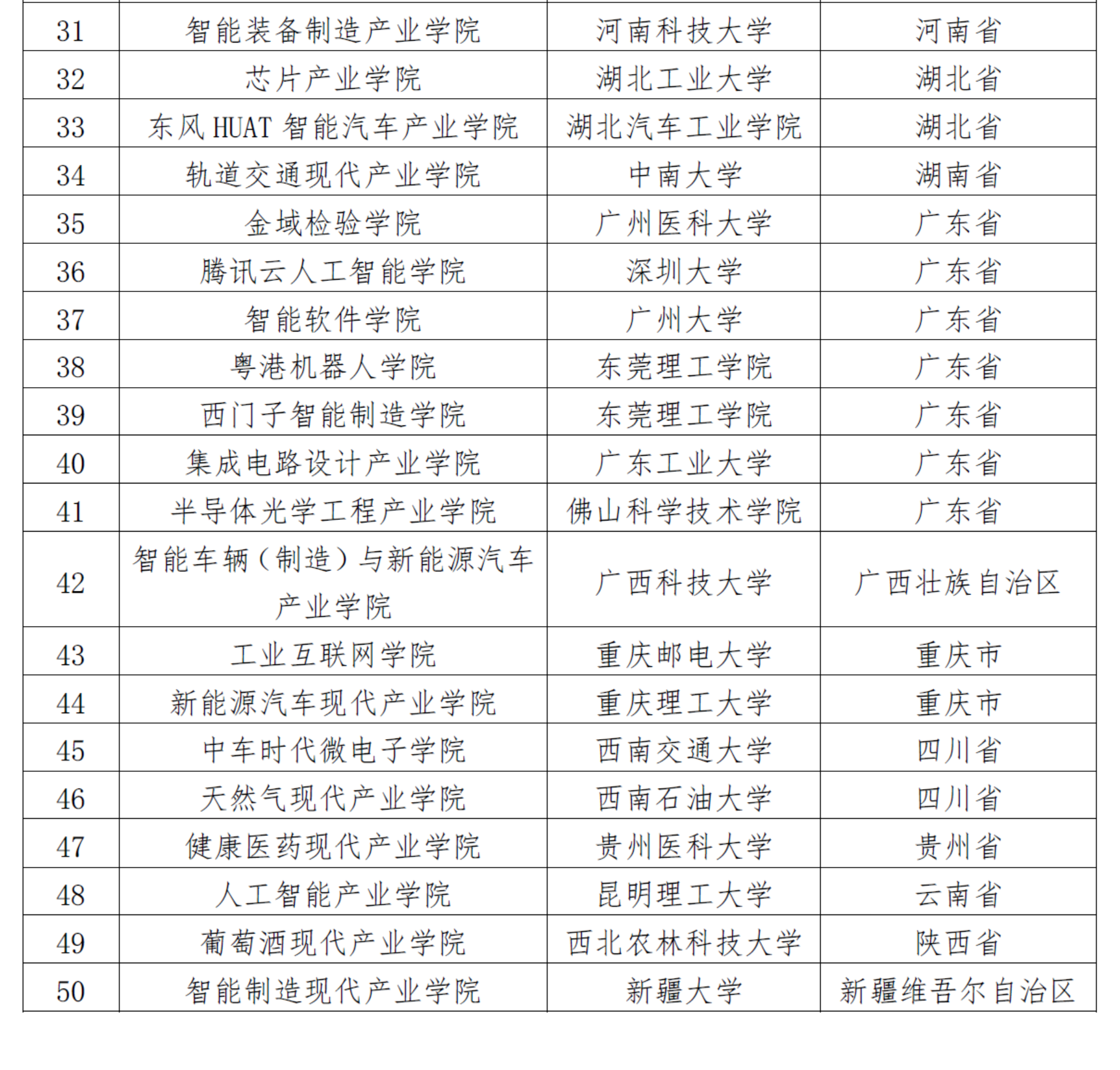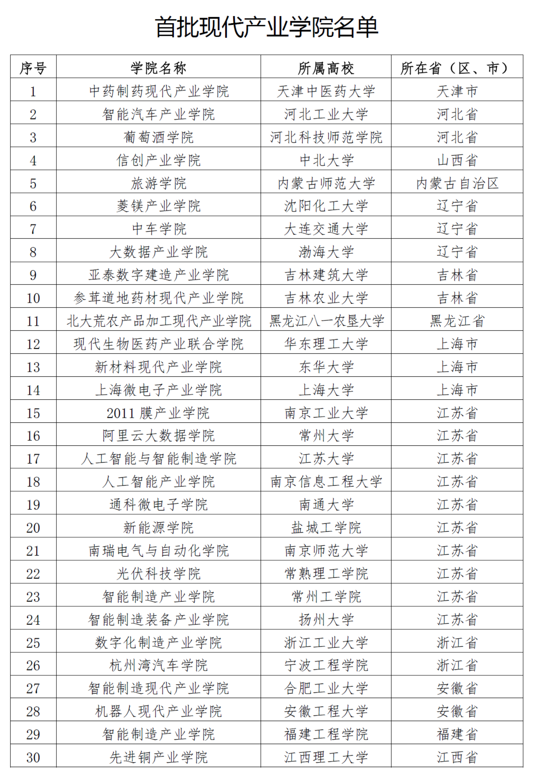 为贯彻落实中央人才工作会议精神,推进新工科建设全面深化,加快现代产业学院建设,根据《教育部办公厅 工业和信息化部办公厅关于印发〈现代产业学院建设指南(试行)〉的通知》(教高厅函〔2020〕16号)等文件要求,在各地各高校申报、专家综合评议的基础上,教育部、工业和信息化部按相关工作程序确定了首批现代产业学院名单,现印发给你们(见附件)。请首批学院建设高校认真落实相关文件要求,高质量推进学院建设工作。