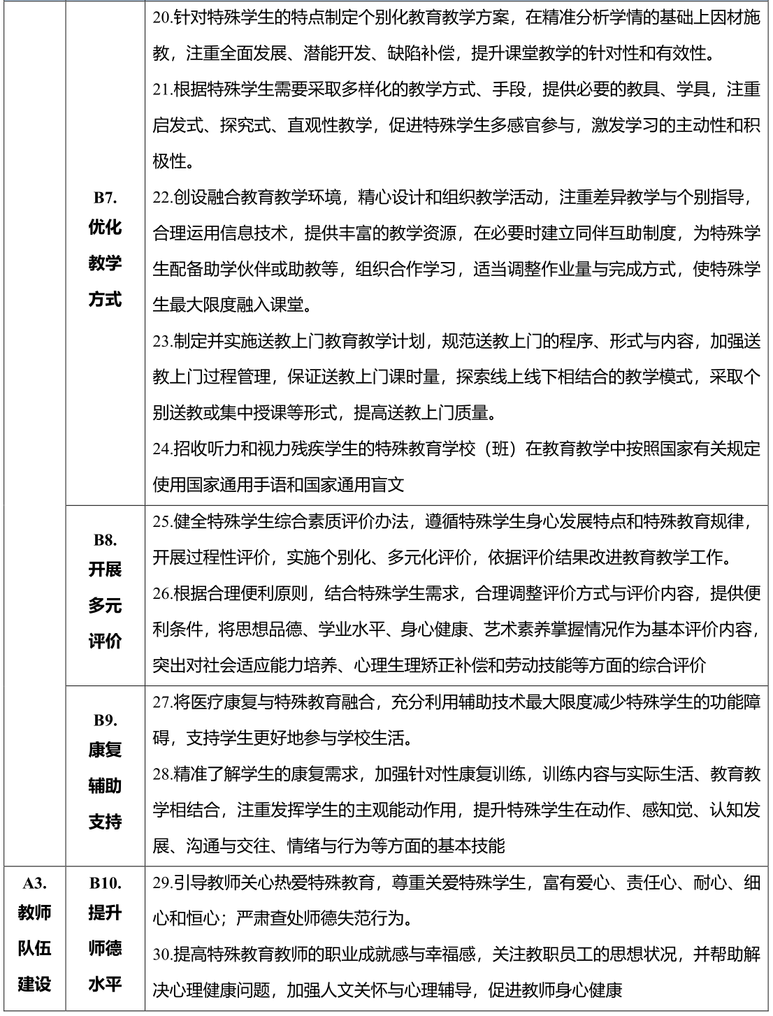 (二)课程教学实施。包括规范课程设置、优化教学方式、开展多元评价、康复辅助支持等4项关键指标,旨在推动学校遵循特殊教育规律和特殊儿童学习特点,落实课程方案,规范使用教材,优化课程内容与教学方法,改革评价方式,提供辅助支持与康复训练,全面提高特殊学生受教育质量。