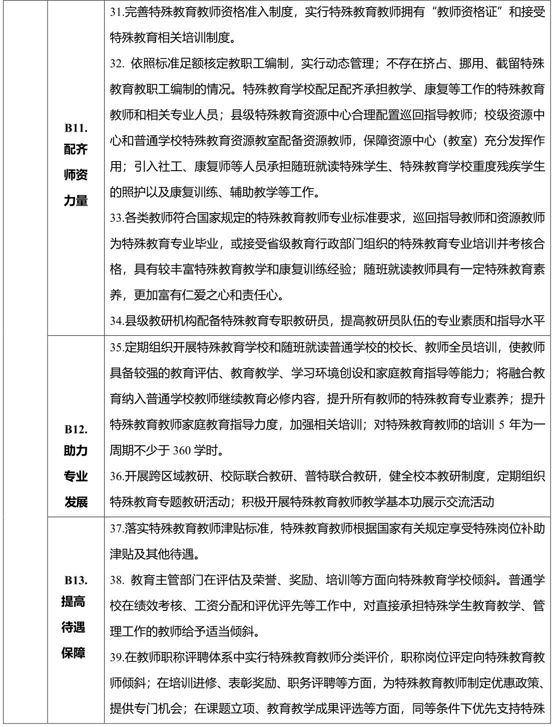 (三)教师队伍建设。包括提升师德水平、配齐师资力量、助力专业发展、提高待遇保障等4项关键指标,旨在促进学校加强教师思想政治和师德师风建设工作,加大力度配备特殊教育专业教师,健全教师专业发展机制,切实提高教师特殊教育专业素质,完善激励机制,提升教师职业幸福感,激发教育教学的积极性和创造性。