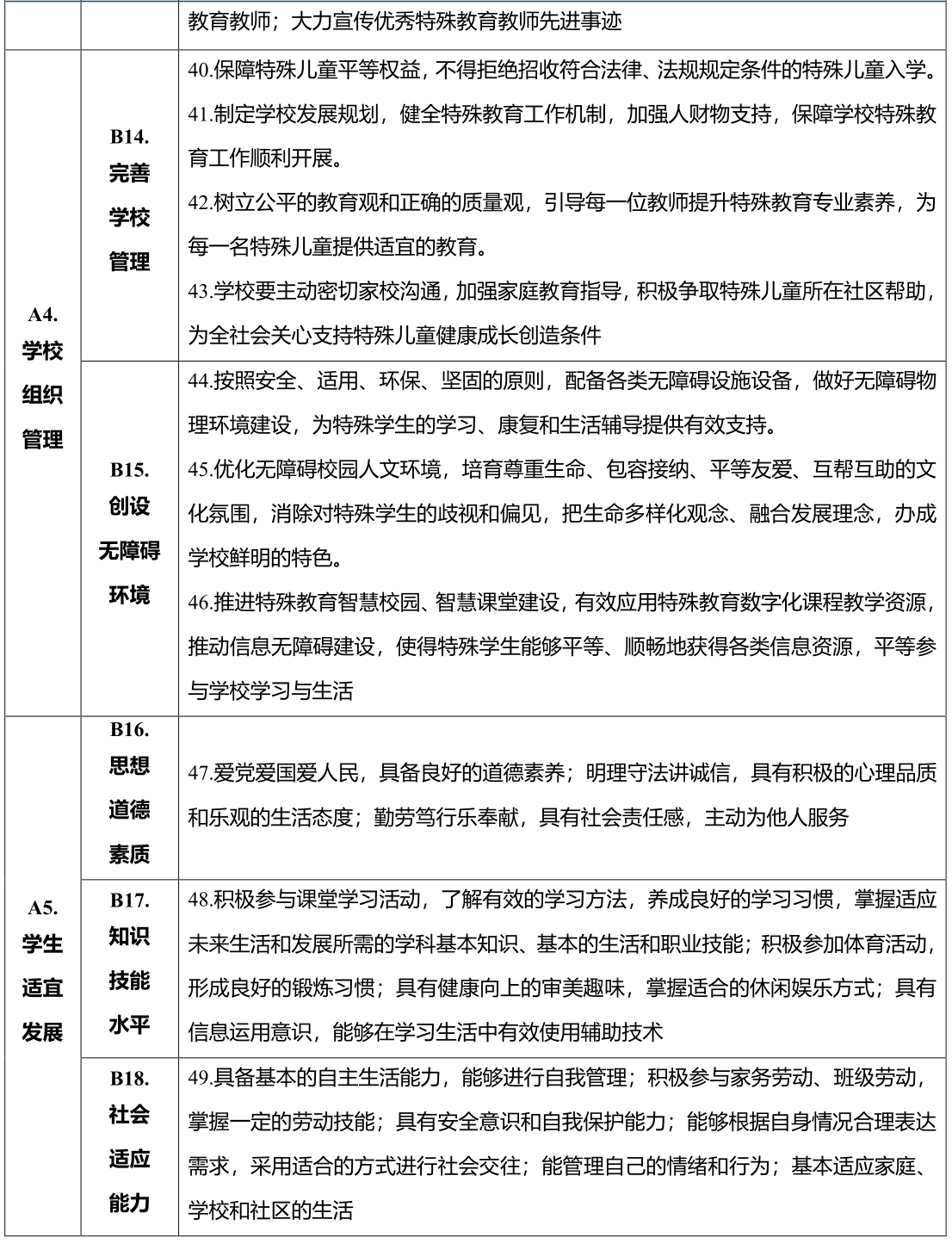 (五)学生适宜发展。包括思想道德素质、知识技能水平、社会适应能力等3项关键指标,旨在促进特殊学生具备良好的道德品质,掌握适应未来发展所需基本的知识技能,努力将特殊学生培养为自尊、自信、自强、自立的国家有用之才。