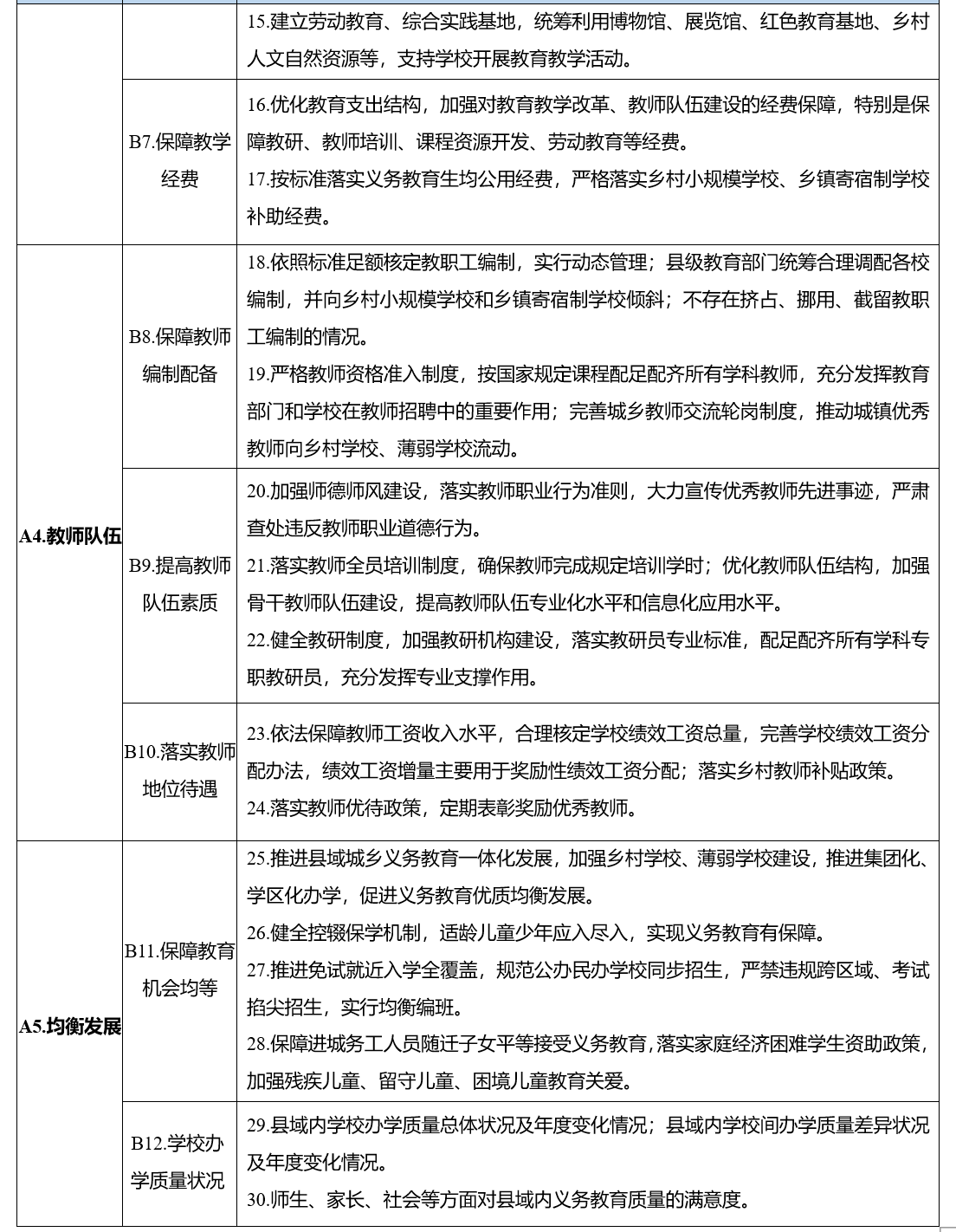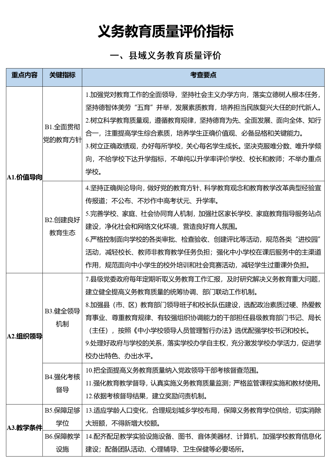 (一)县域义务教育质量评价。主要包括价值导向、组织领导、教学条件、教师队伍、均衡发展等五个方面重点内容,旨在促进地方党委政府坚持社会主义办学方向,加强对义务教育工作的领导,履行举办义务教育职责,促进县域义务教育优质均衡发展。