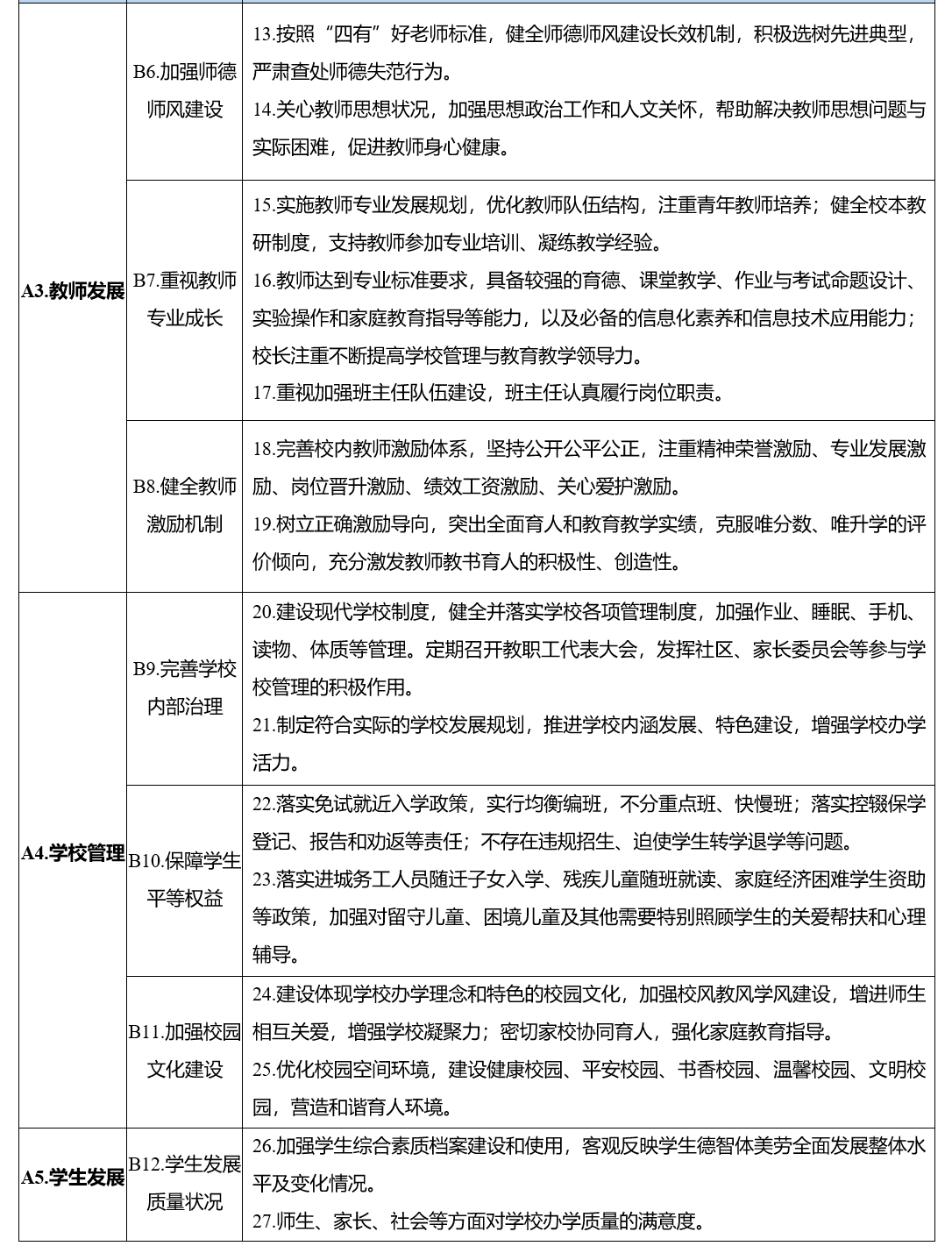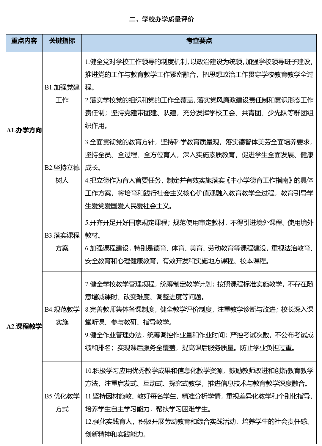 (二)学校办学质量评价。主要包括办学方向、课程教学、教师发展、学校管理、学生发展等五个方面重点内容,旨在促进学校落实德智体美劳全面培养要求,深入实施素质教育,充分激发办学活力,不断提高办学水平和育人质量。