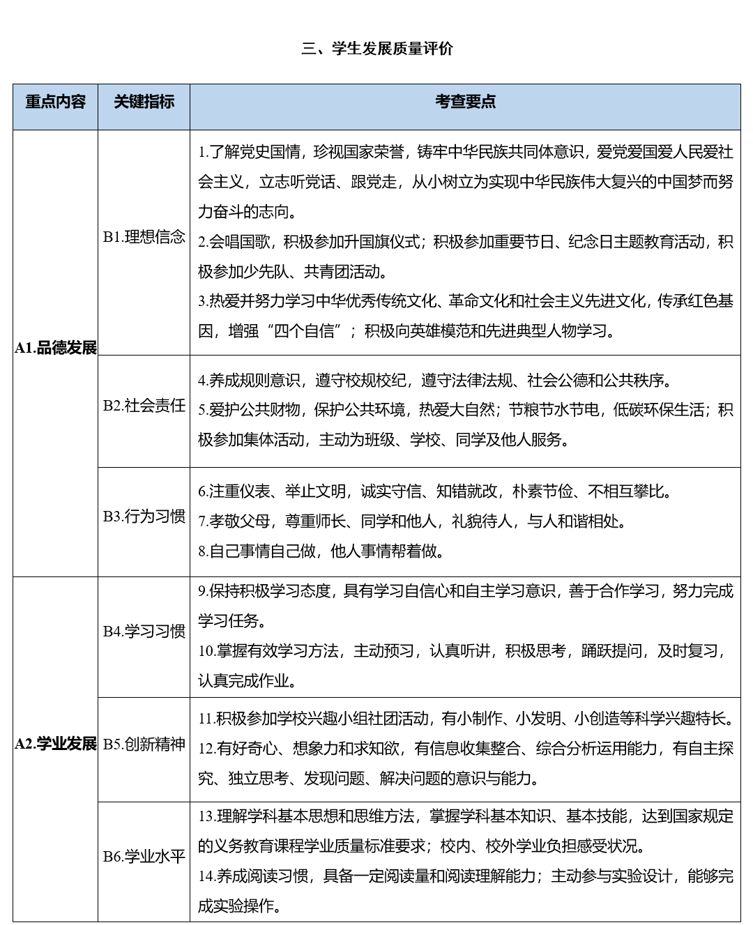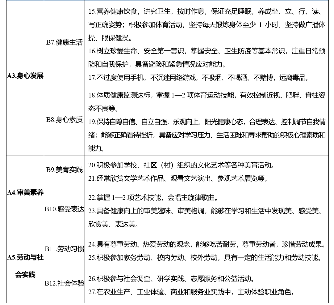 (三)学生发展质量评价。主要包括学生品德发展、学业发展、身心发展、审美素养、劳动与社会实践等五个方面重点内容,旨在促进学生德智体美劳全面发展,培养适应终身发展和社会发展需要的正确价值观、必备品格和关键能力。