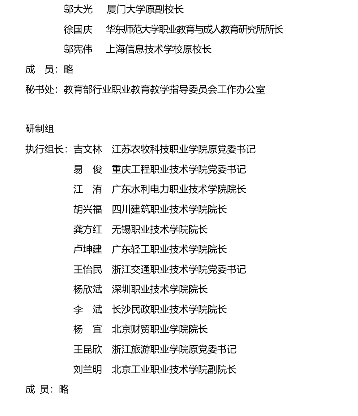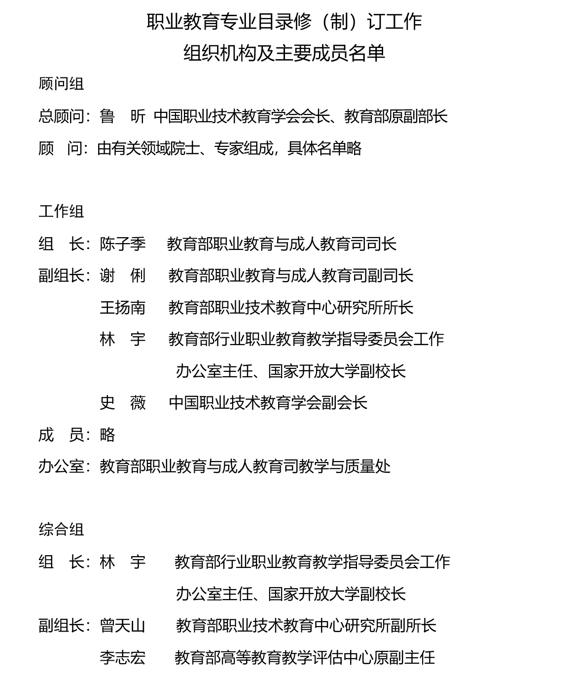2.工作组。主要负责制订工作方案,统筹组织修(制)订工作,对接顾问组,领导综合组、研制组工作,确定目录和专业简介的体例框架与内容要求,组织审定和发布目录,组织有关总结、宣传和实施工作,协调解决其他相关问题。工作组由教育部职成司牵头,教育部职教所、教育部行业职业教育教学指导委员会(简称行指委)工作办公室、中国职业技术教育学会有关人员共同组成。工作组办公室设在教育部职成司有关处室。